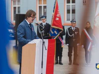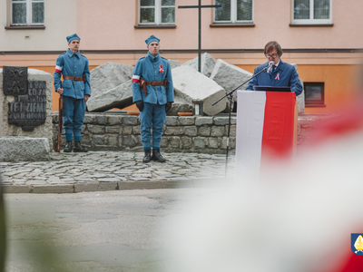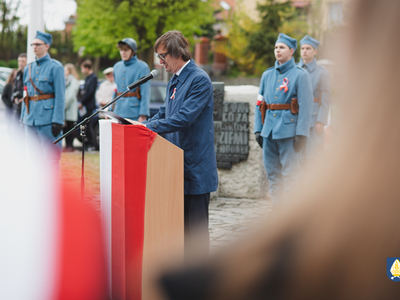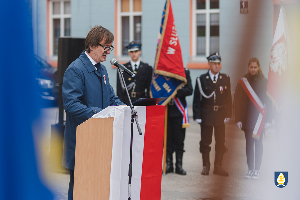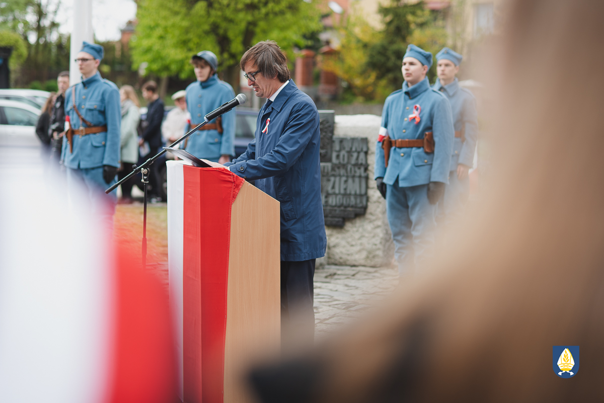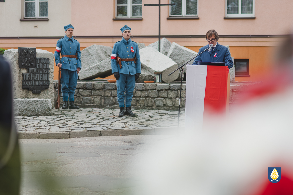 sztandarowych oraz grupy rekonstrukcyjnej uczestnicy uroczystości udali się pod pomnik przy Placu Wolności. Tam, odbyło się uroczyste podniesienie flagi państwowej Rzeczpospolitej Polskiej oraz wystąpienie Burmistrza Miasta i Gminy Pelplin Mirosława Chyły. Następnie po odśpiewaniu kilku patriotycznych pieśni zostały złożone wiązanki kwiatów przez obecne delegację m.in. z lokalnych instytucji, zakładów pracy, partii politycznych, stowarzyszeń, szkół oraz innych organizacji.
