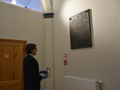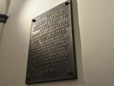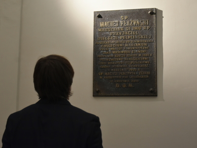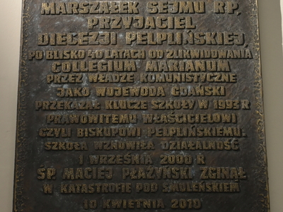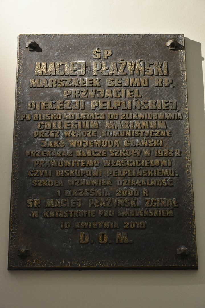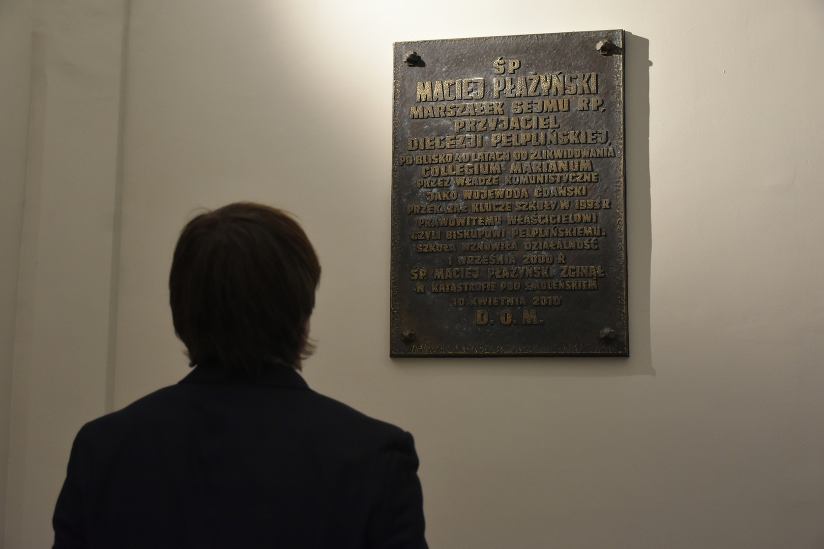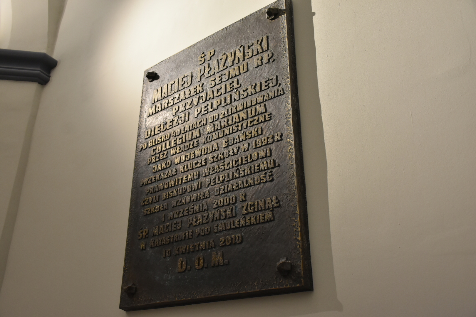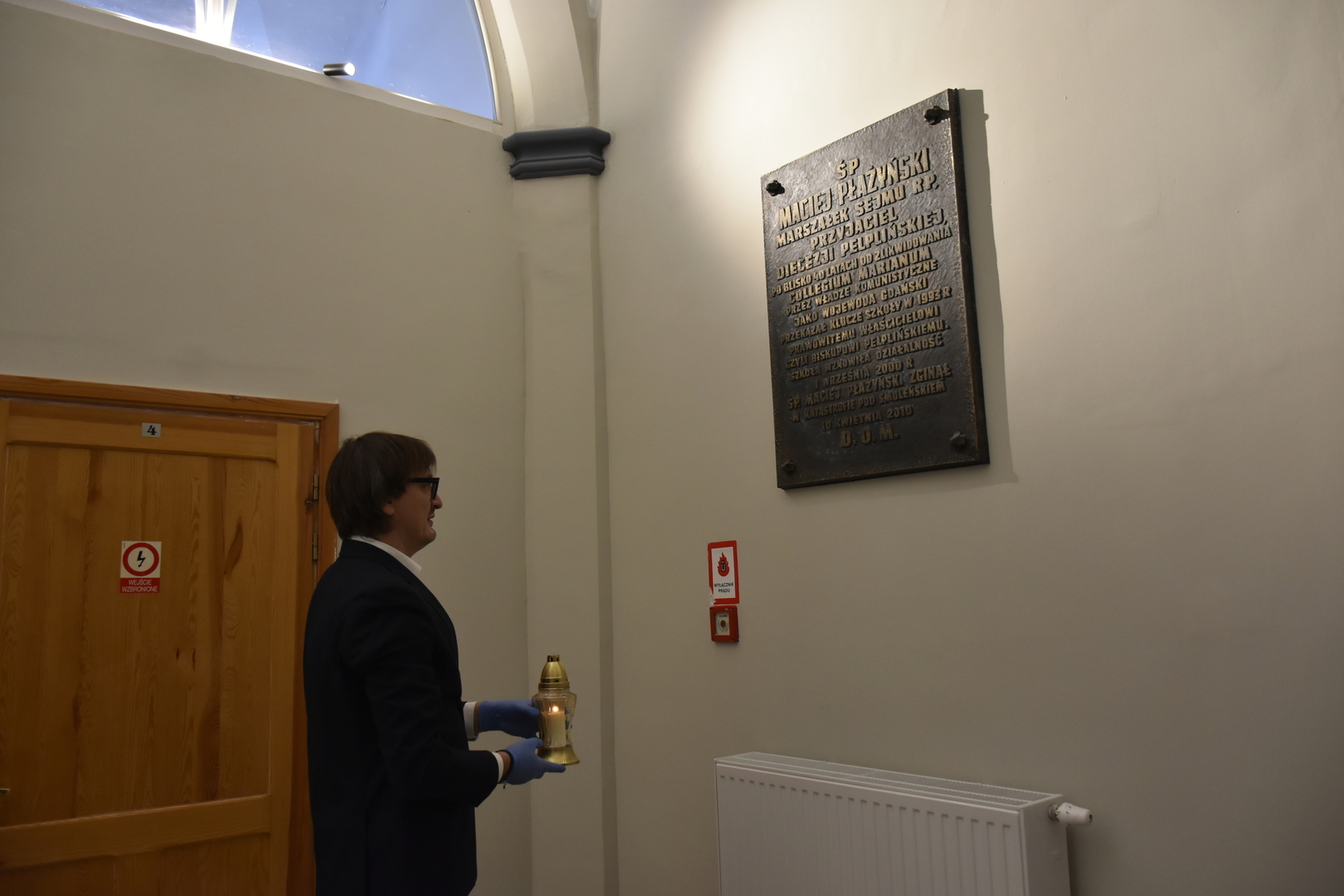 Burmistrz Miasta i Gminy Pelplin zapalił również znicz przy tablicy pamiątkowej poświęconej Marszałkowi Sejmu RP. śp. Maciejowi Płażyńskiemu, znajdującej się w budynku Collegium Marianum.