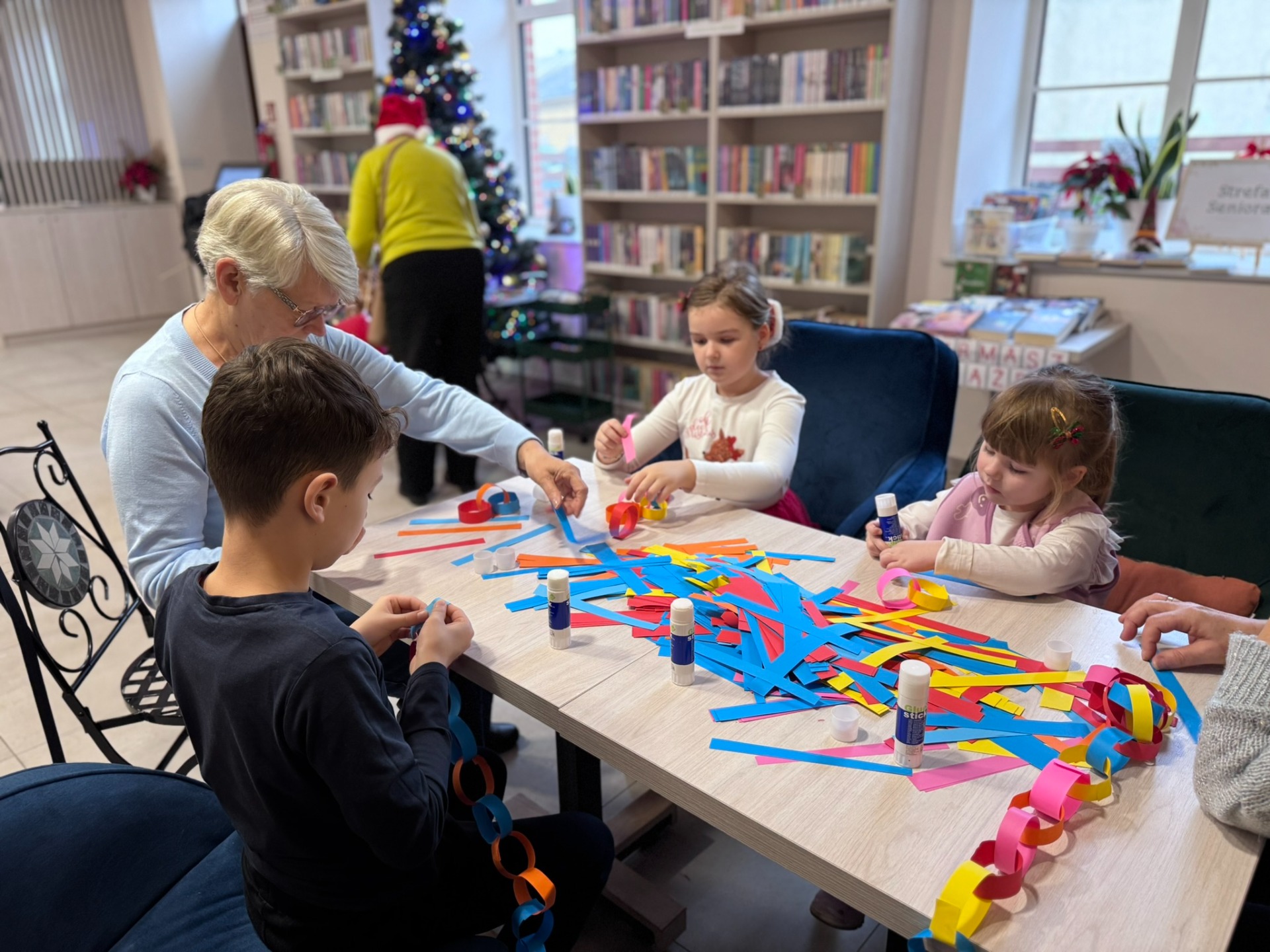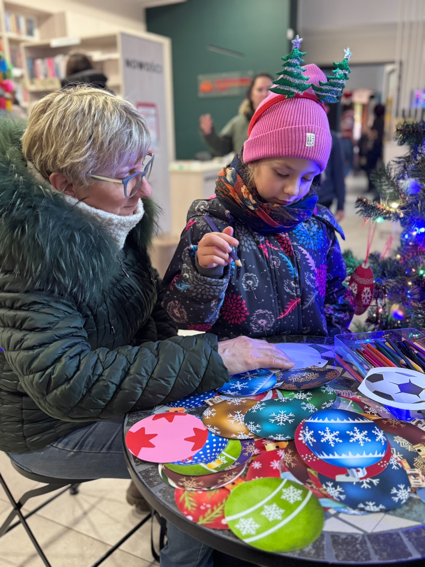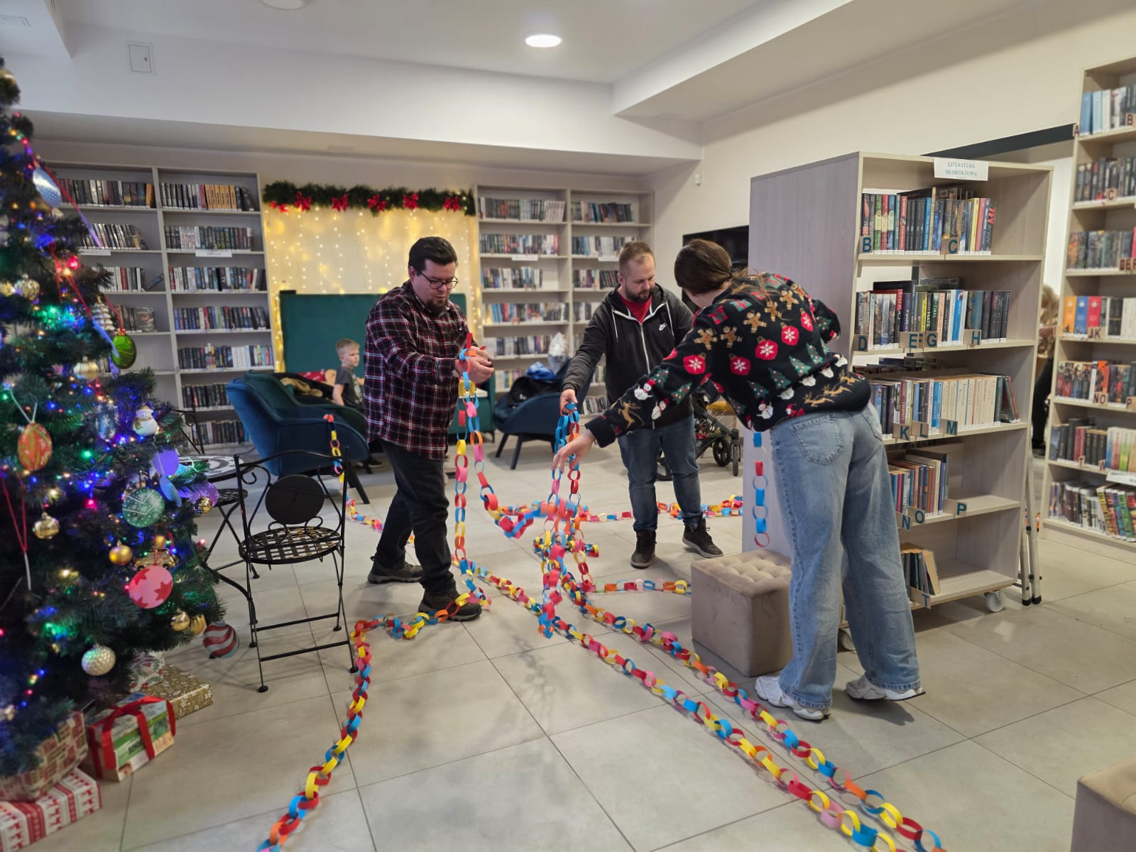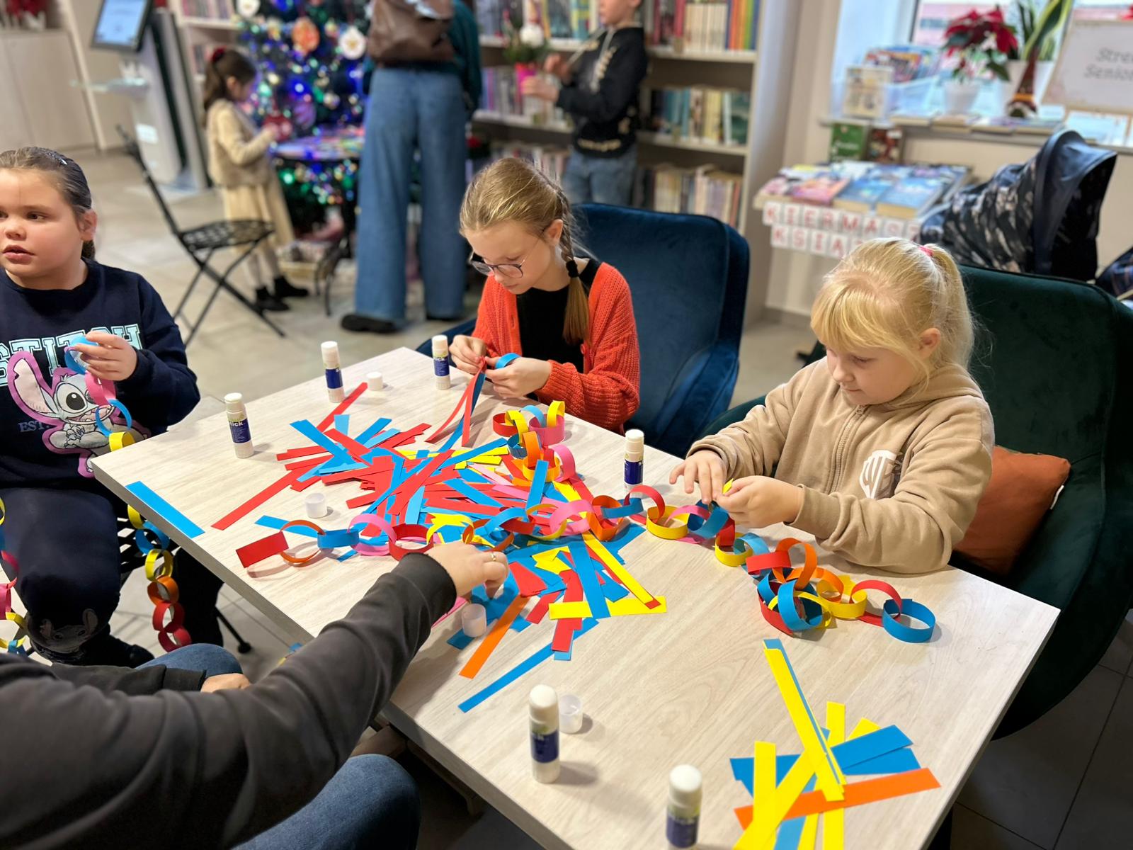 Mikołajki odbywały się także w Miejskiej Bibliotece Publicznej w Pelplinie, a dokładniej w Kawiarence pod Zegarem. Biblioteka tego dnia tętniła życiem od godzin porannych aż do popołudnia. W programie znalazły się m.in. spotkania dzieci z Mikołajem, warsztaty tworzenia stroików bożonarodzeniowych, a także wspólne budowanie świątecznych ozdób z klocków Lego. Tego dnia tworzono również najdłuższy świąteczny łańcuch, który zawisł następnie w bibliotece. Dużym zainteresowaniem cieszyła się także mikołajkowa krzyżówka oraz drzewko pozdrowień, na którym mieszkańcy wieszali świąteczne życzenia dla bliskich.