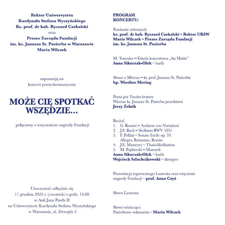 11 grudnia 2025 r. w auli Jana Pawła II na Uniwersytecie Kardynała Stefana Wyszyńskiego odbył się koncert poetycko-muzyczny zatytułowany „Może cię spotkać wszędzie…”. Gości powitali prezes Fundacji im. Ks. Janusza St. Pasierba Maria Wilczek – niestrudzona strażniczka pamięci o Pelplińskim Poecie – oraz prorektor UKSW ks. prof. dr hab. Piotr Tomasik. Swojego mistrza z czasów studiów w pelplińskim WSD wspominał bardzo serdecznie ks. bp Wiesław Mering. Wiersze i fragmenty esejów odczytał Jerzy Zelnik – jeden z najlepszych interpretatorów twórczości ks. Pasierba. W części muzycznej utwory m.in. J.S. Bacha, G. Rossiniego, F. Polliniego zebrani usłyszeli w wykonaniu Anna Sikorzak-Olek (harfa) oraz Wojciecha Szlachcikowskiego (skrzypce). Wręczona została nagroda Fundacji, którą w tym roku otrzymała dr Anna Czerwińska-Walczak za książkę „U źródeł współczesnej konserwacji malarstwa w Polsce. Studium działalności Bohdana Marconiego”. W auli dominowała młodzież: uczniowie trzech szkół, którym patronuje ks. Janusz St. Pasierb. Oprócz uczniów z Pelplina była także młodzież z Zespołu Szkół Ekonomicznych w Tczewie oraz Zespołu Szkół Ponadpodstawowych w Żabnie k. Tarnowa.