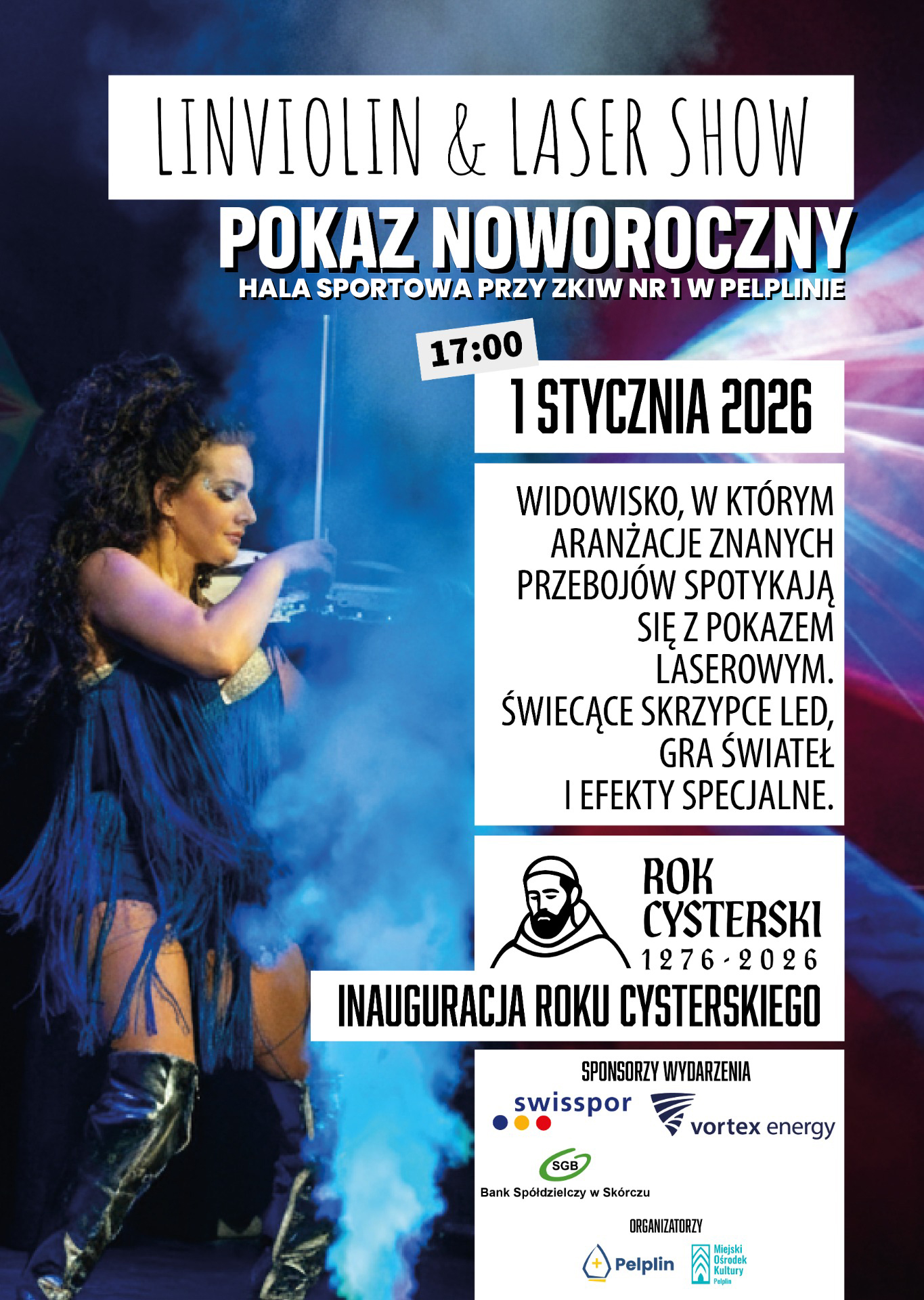 Burmistrz Miasta i Gminy Pelplin Mirosław Chyła zaprasza na noworoczny pokaz, który odbędzie się 1 stycznia 2026 roku o godz. 17:00 na Hali Sportowej przy ZKiW nr 1 w Pelplinie (zmiana miejsca wydarzenia z dnia 30.12).