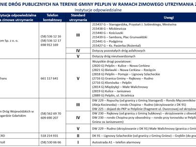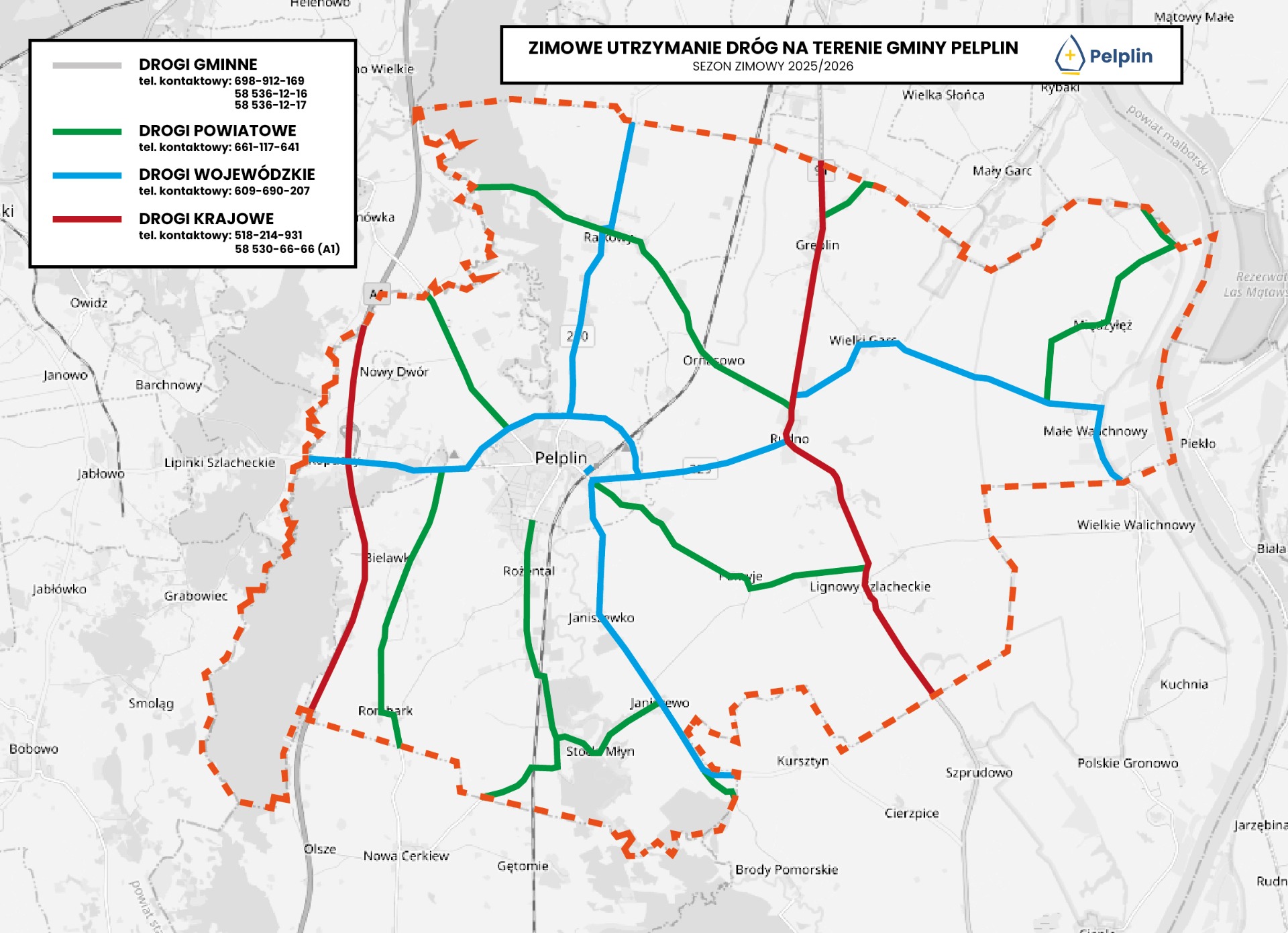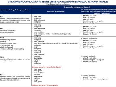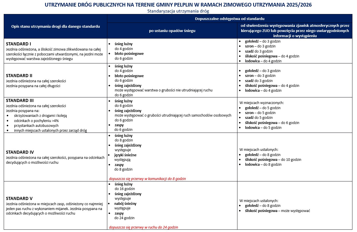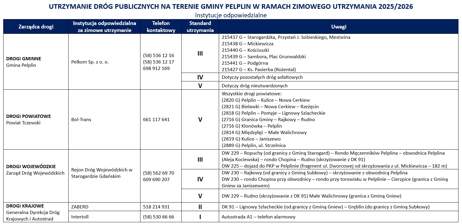 Przypominam Państwu standaryzację zimowego utrzymania dróg na terenie Gminy Pelplin w sezonie zimowym 2025/2026, zarówno gminnych (za które odpowiada spółka Pelkom), jak również pozostałych przebiegających przez naszą gminę (powiatowych, wojewódzkich i krajowych).