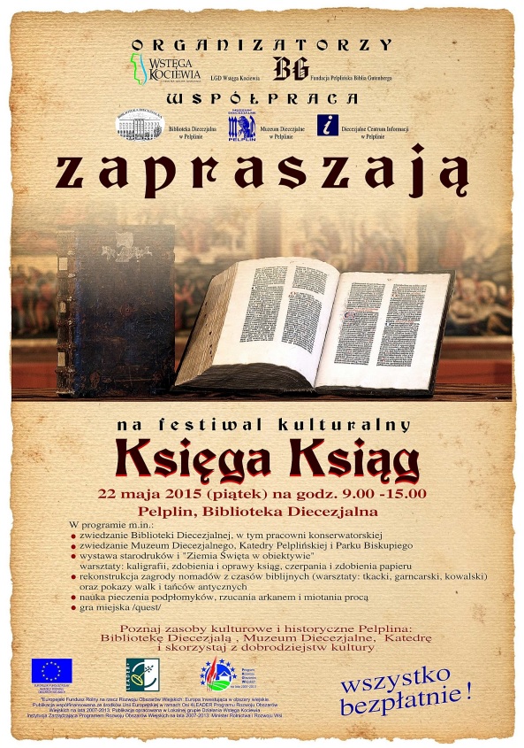 Lokalna Grupa Działania Wstęga Kociewia, wspólnie z Fundacją Pelplińska Biblia Gutenberga, we współpracy z Biblioteką Diecezjalną w Pelplinie, Muzeum Diecezjalnym w Pelplinie i Diecezjalnym Centrum Informacji w Pelplinie po raz kolejny zorganizuje Festiwal Kulturalny „Księga Ksiąg”. Tytuł nawiązuje do najcenniejszego eksponatu ze zbiorów pelplińskiej skarbnicy, czyli Biblii Gutenberga. Impreza odbędzie się 22 maja 2015 r. (piątek) na terenie przy Bibliotece Diecezjalnej.