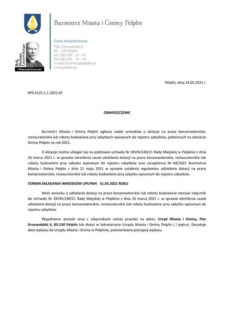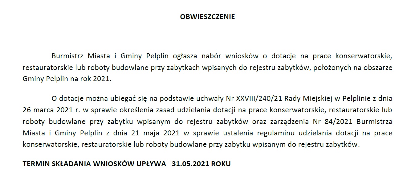 Obwieszczenie Burmistrza Miasta i Gminy Pelplin o naborze wniosków o dotacje na prace konserwatorskie, restauratorskie lub roboty budowlane przy zabytkach położonych na obszarze Gminy Pelplin na rok 2021.