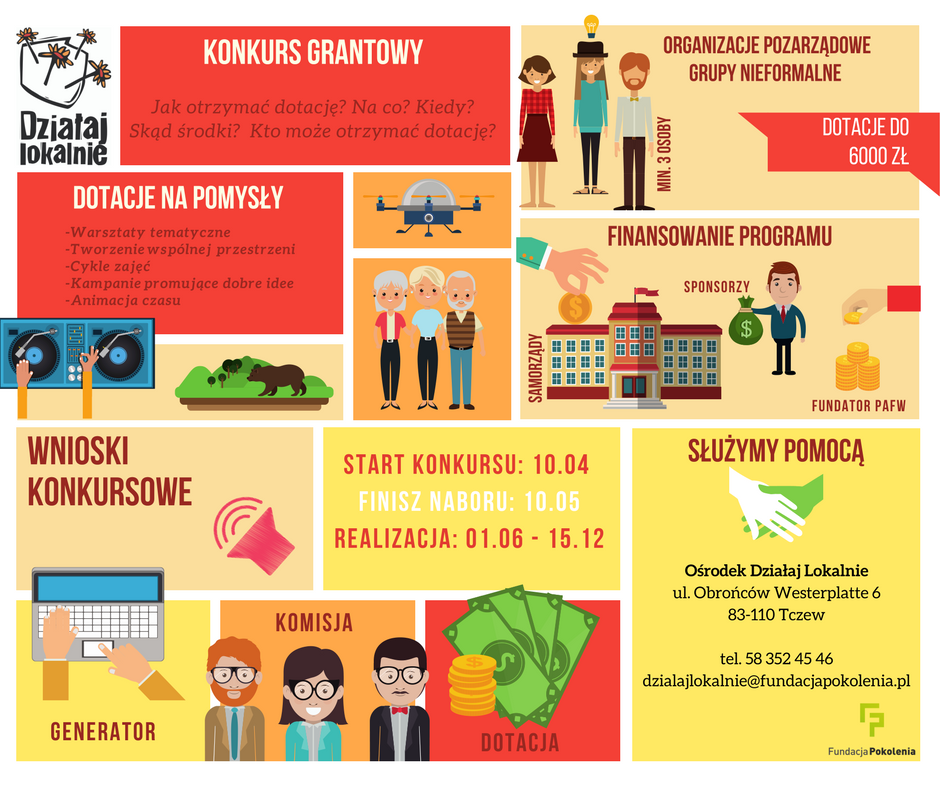 Tegoroczny konkurs grantowy to już trzynasta odsłona programu Działaj Lokalnie na terenie powiatu tczewskiego. Dzięki wsparciu fundatora (Polsko-Amerykańskiej Fundacji Wolności), gmin oraz sponsora – Banku Spółdzielczego w Tczewie, Fundacja Pokolenia rozdysponuje środki na inicjatywy lokalne. Szansę na zdobycie dotacji do 6 tys. zł mają grupy nieformalne oraz organizacje pozarządowe.
