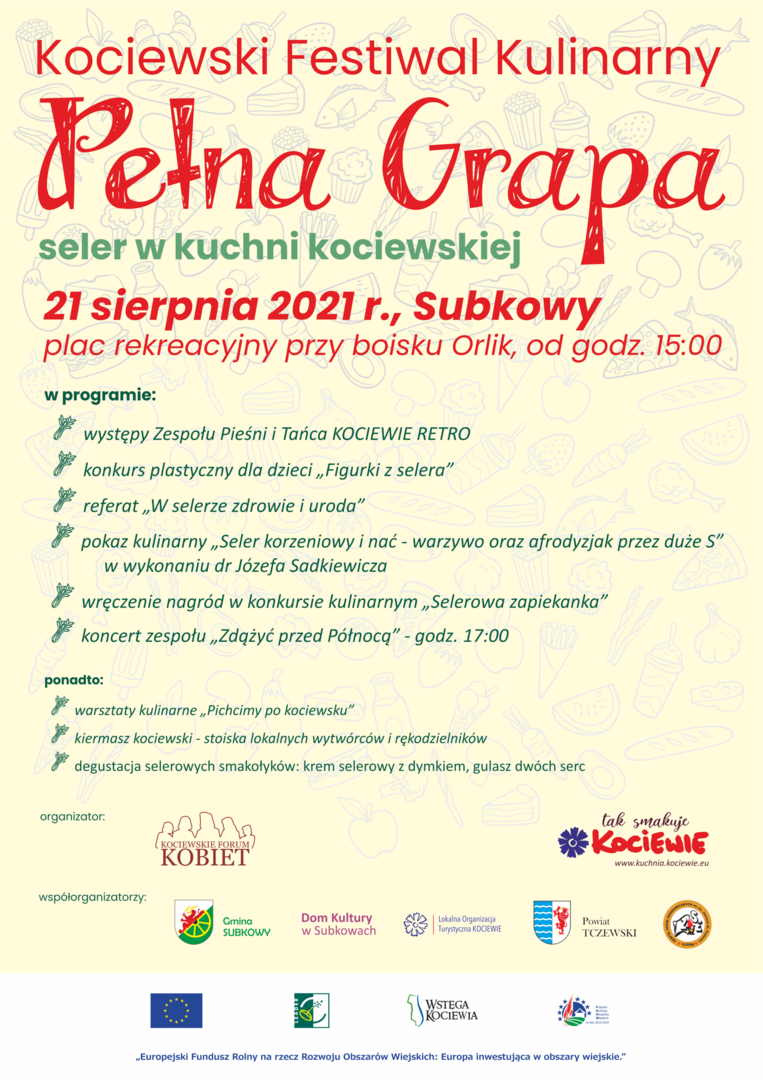 Kociewskie Forum Kobiet wraz z partnerami: Powiatem Tczewskim, Gminą Subkowy i Domem Kultury w Subkowach zaprasza na „Kociewski Festiwal Kulinarny - Pełna Grapa”.