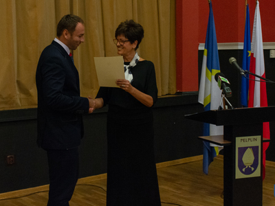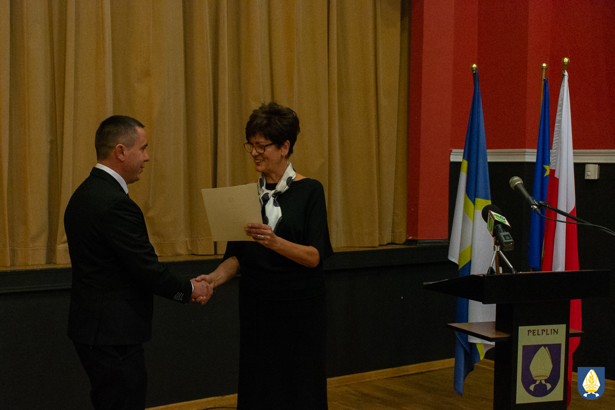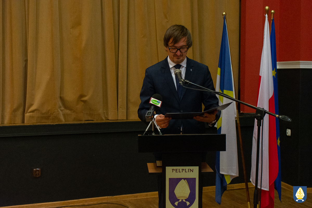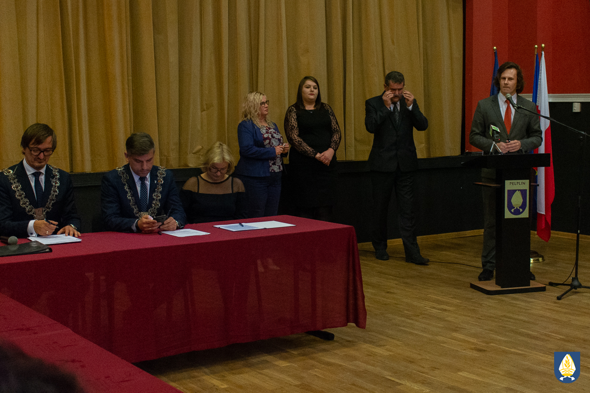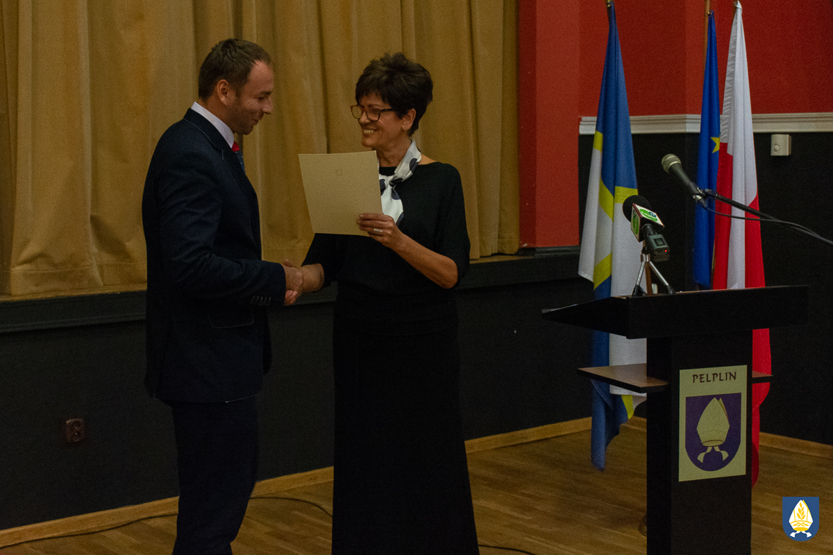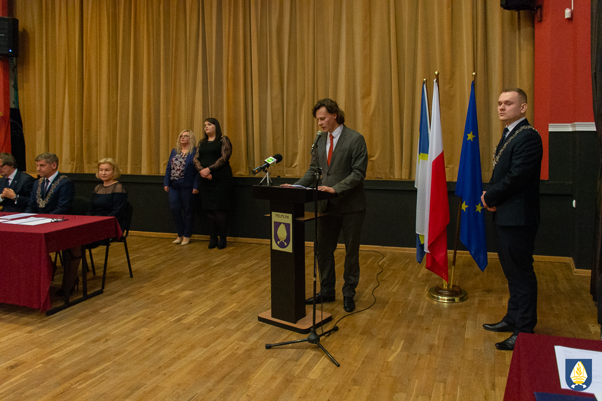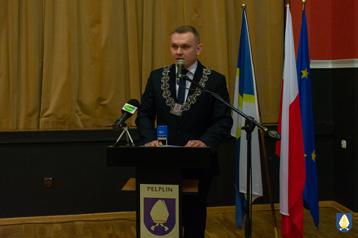 Pan Mirosław Chyła Burmistrz Miasta i Gminy Pelplin odebrał zaświadczenie o wyborze i złożył ślubowanie, a Pan Tomasz Czerwiński dotychczas Pełniący Funkcję Burmistrza z gratulacjami, symbolicznie przekazał insygnia władzy samorządowej – łańcuch Burmistrza oraz pieczęć.