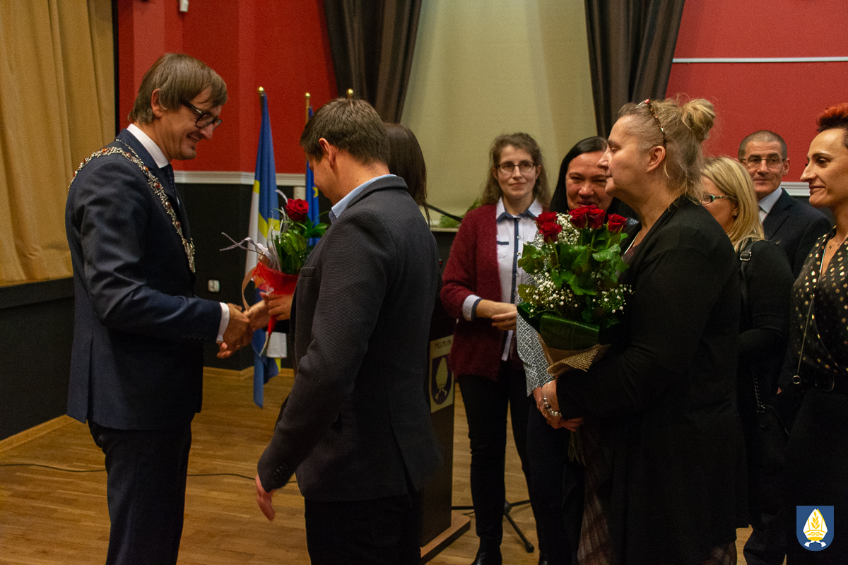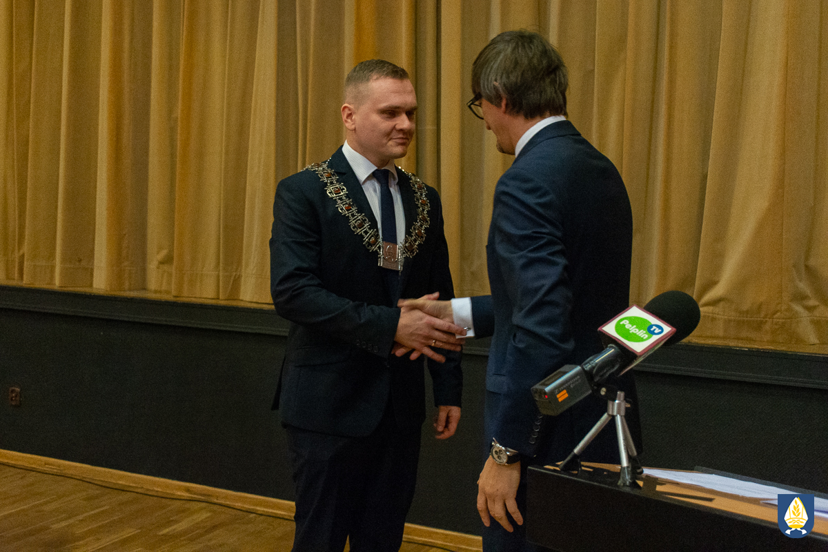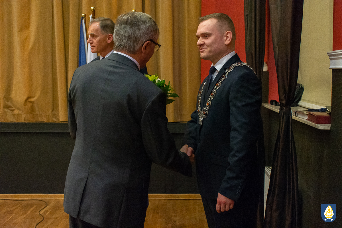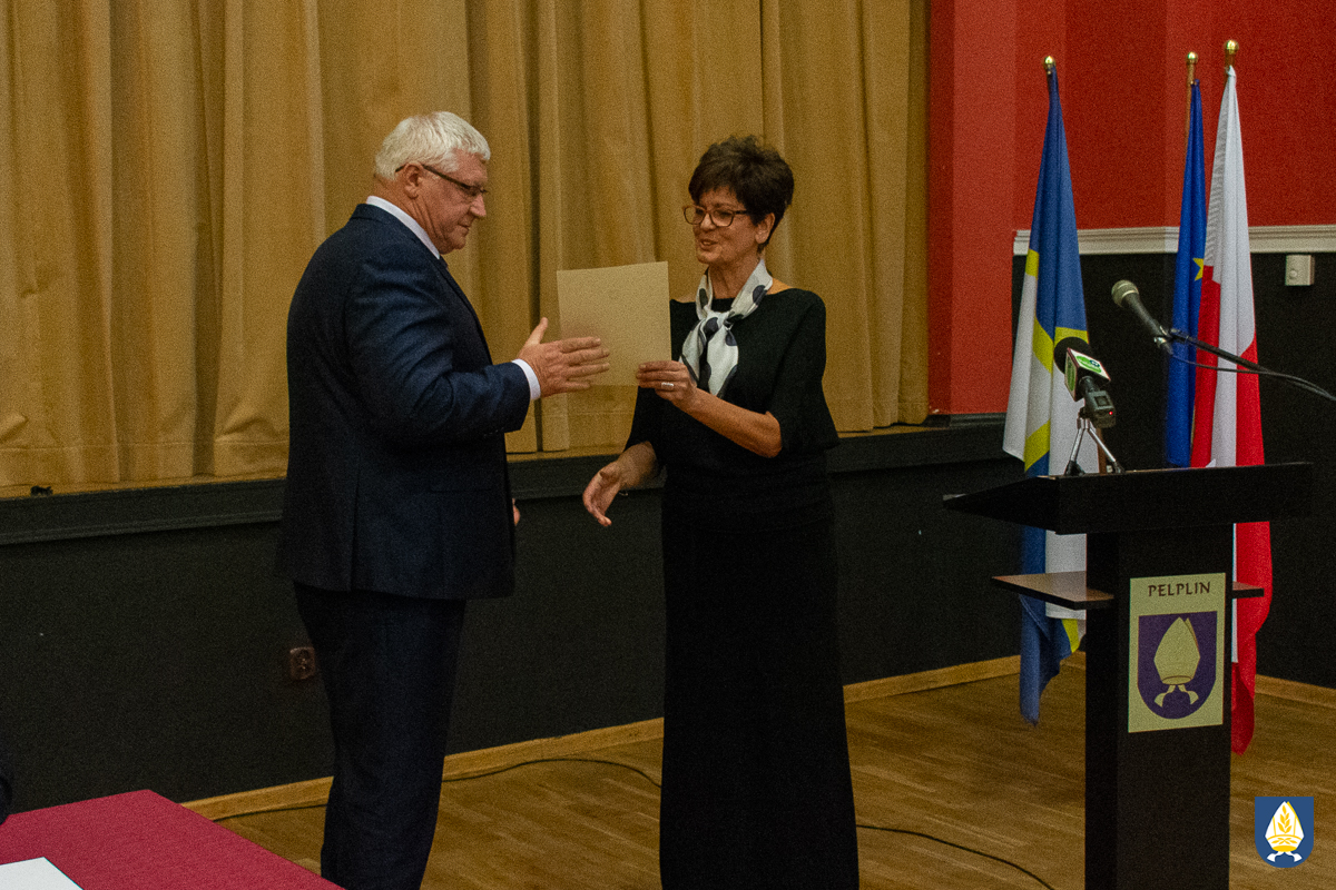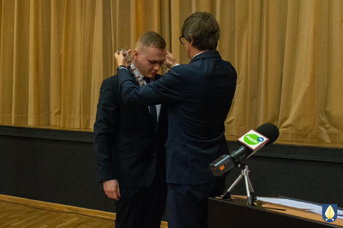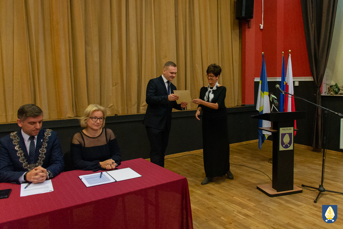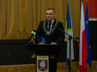 Pan Mirosław Chyła Burmistrz Miasta i Gminy Pelplin odebrał zaświadczenie o wyborze i złożył ślubowanie, a Pan Tomasz Czerwiński dotychczas Pełniący Funkcję Burmistrza z gratulacjami, symbolicznie przekazał insygnia władzy samorządowej – łańcuch Burmistrza oraz pieczęć.