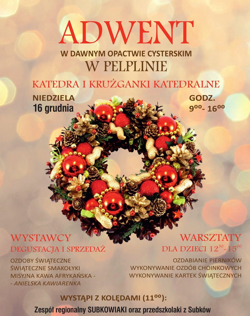 Wielkim krokami zbliża się kolejny Adwent w Dawnym Opactwie Cysterskim w Pelplinie. Przeżyjmy razem czas radosnego oczekiwania na powtórne przyjście Chrystusa, spotykając się w niedzielę 16 grudnia 2018 r. w krużgankach pelplińskiego opactwa w godzinach 9.00 - 16.00. Wspólne śpiewanie kolęd, kiermasz bożonarodzeniowy, degustacja oraz sprzedaż świątecznych potraw, warsztaty dla najmłodszych, prezentacja Gwizdów kociewskich to tylko część atrakcji.