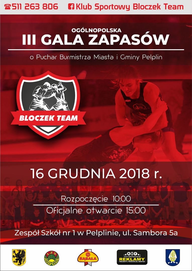 Klub Sportowy Bloczek Team zaprasza na III Galę Zapasów o Puchar Burmistrza Miasta i Gminy Pelplin. Zawody odbędą się 16 grudnia 2018 r. w hali sportowej przy Zespole Kształcenia i Wychowania nr 1 w Pelplinie. Walki eliminacyjne zaczną się już o godzinie 10.00, natomiast na oficjalne otwarcie i walki finałowe zapraszamy o godz. 15.00. W zawodach będą uczestniczyć zawodnicy z całego kraju, na czele z najlepszymi zawodniczkami i zawodnikami KS Bloczek Team.