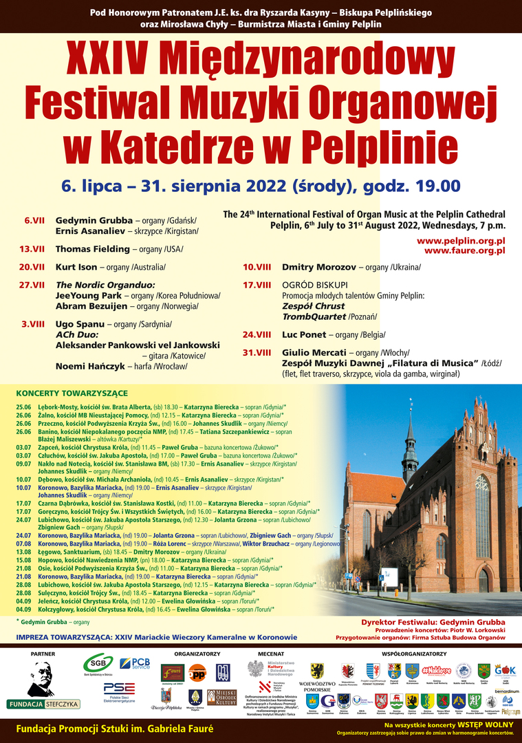 Od 6 lipca do 31 sierpnia 2022 w Bazylice Katedralnej w Pelplinie trwać będzie kolejna edycja Międzynarodowego Festiwalu Muzyki Organowej. Koncerty w ramach festiwalu odbywać się będą w każdą środę lipca i sierpnia o godz. 19.00 w pelplińskiej katedrze.