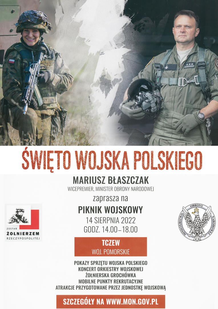 W imieniu Ministra Obrony Narodowej zapraszamy serdecznie na piknik wojskowy organizowany przez Wojskowe Centrum Rekrutacji w Malborku, który odbędzie się w dniu 14 sierpnia w godzinach 14:00 - 18:00 na Bulwarze Nadwiślańskim w Tczewie.