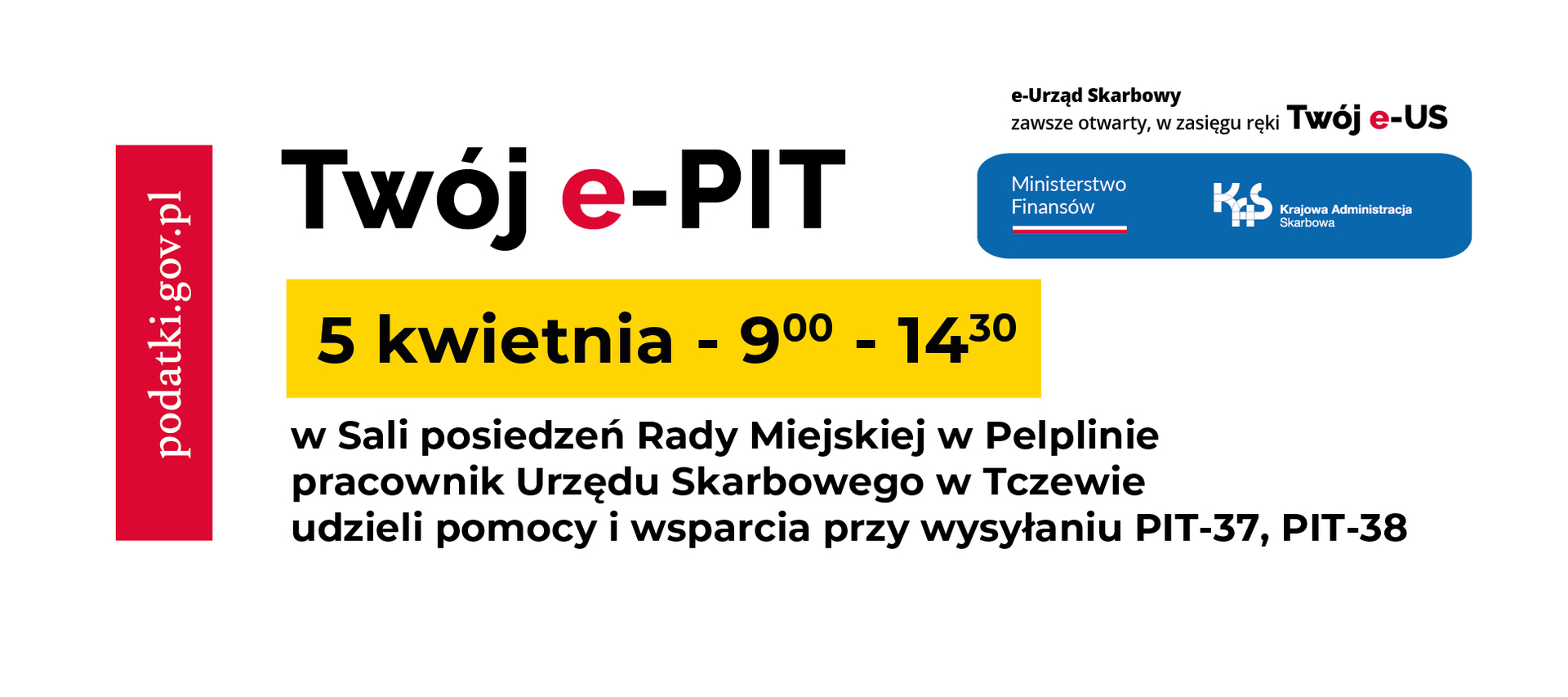 5 kwietnia (środa) w godz. od 9:00 do 14:30 w Sali posiedzeń Rady Miejskiej w Pelplinie przy Placu Grunwaldzkim 2 w Pelplinie pracownik Urzędu Skarbowego w Tczewie udzieli pomocy i wsparcia przy wysyłaniu PIT-37, PIT-38 poprzez aplikację e-Urząd Skarbowy.