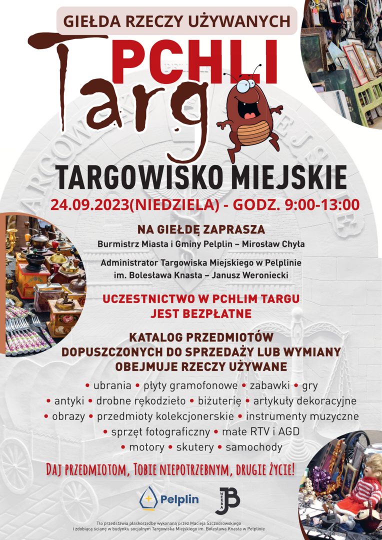 Burmistrz Miasta i Gminy Pelplin Mirosław Chyła oraz Administrator Targowiska Miejskiego w Pelplinie im. Bolesława Knasta Janusz Weroniecki zapraszają na Giełdę rzeczy używanych - Pchli Targ, który odbędzie się 24 września 2023 r. w godzinach 9:00 - 13:00 na Targowisku Miejskim.
